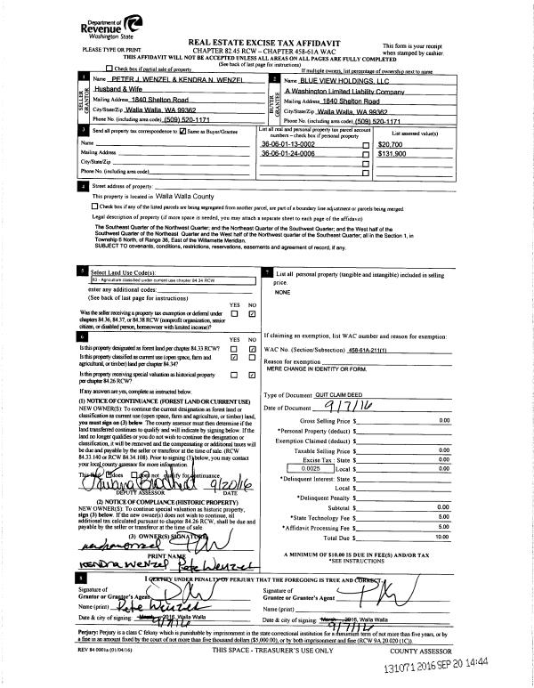 | 1 | 09/07/2016 | QCD | QUIT CLAIM DEED | WENZEL PETE & KENDRA | BLUE VIEW HOLDINGS LLC | | | $0.00 | 131071 | 2016-07695 |