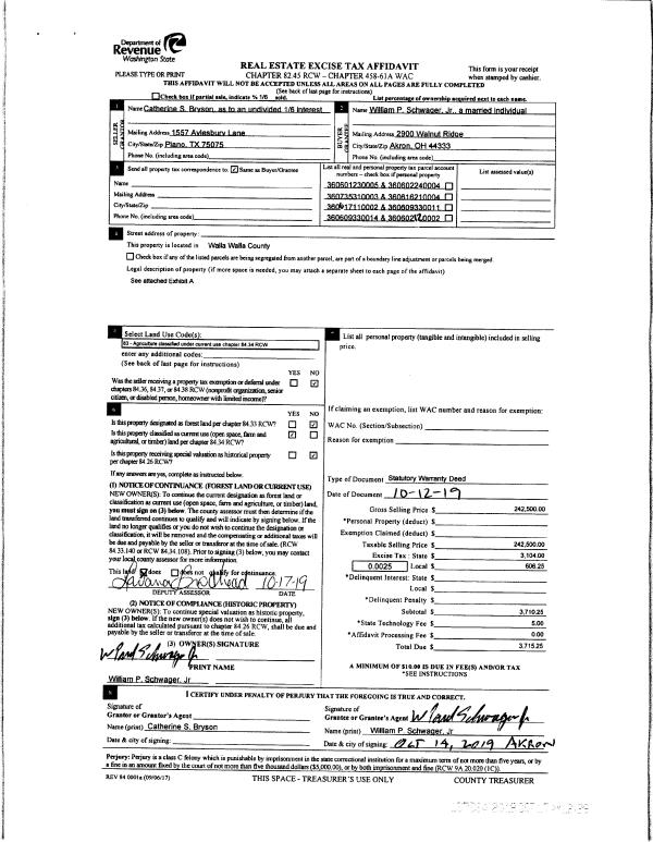 | 3 | 01/10/2020 | SWD | STATUTORY WARRANTY DEED | SCHWAGER WILLIAM PAUL JR (ET AL) | SCHWAGER WILLIAM P JR | | 8-PARCLES | $242,500.00 | 138394 | 2020-00219 |