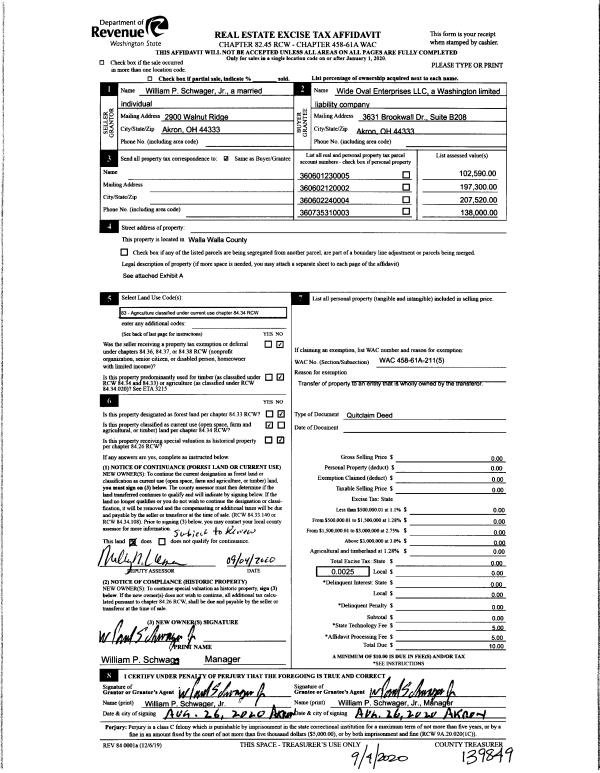 | 1 | 09/04/2020 | QCD | QUIT CLAIM DEED | SCHWAGER WILLIAM P JR | WIDE OVAL ENTERPRISES LLC | | | | 139849 | 2020-08986 |