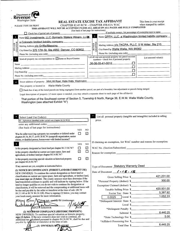 | 2 | 01/16/2015 | SWD | STATUTORY WARRANTY DEED | WATERS WINERY LLC | GPFH LLC | | | $420,931.00 | 127293 | 2015-00391 |