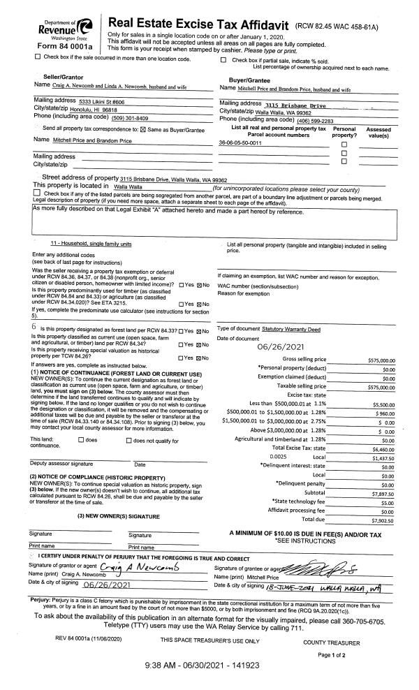 | 1 | 06/30/2021 | SWD | STATUTORY WARRANTY DEED | NEWCOMB CRAIG A & LINDA A | PRICE MITCHELL & BRANDOM | | | $575,000.00 | 141923 | 2021-07911 |