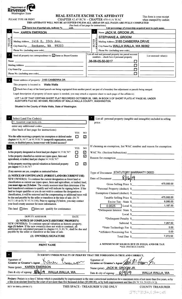 | 1 | 08/19/2019 | SWD | STATUTORY WARRANTY DEED | EMERSON KAREN | GROOM JACK M JR & STEPHANIE A | | | $475,000.00 | 137517 | 2019-06278 |