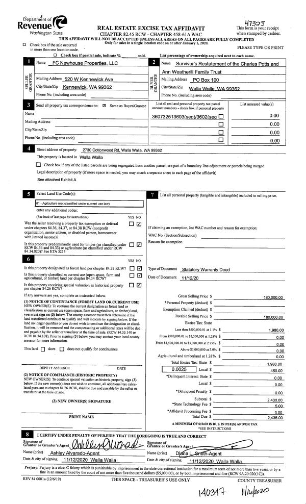 | 1 | 11/16/2020 | WARRANTY D | WARRANTY DEED | FC NEWHOUSE PROPERTIES LLC | CHARLES POTTS & ANN WEATHERILL FAMILY TRUST | | | | 140347 | 2020-12104 |