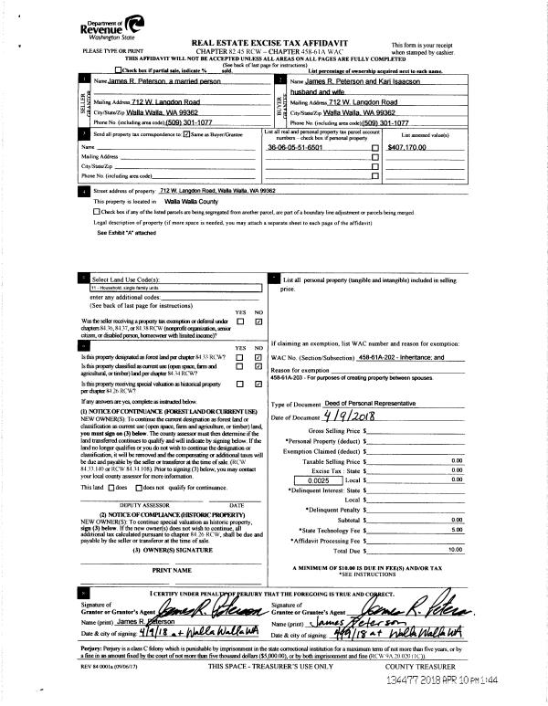 | 1 | 04/09/2018 | DPR | DEED OF PERSONAL REPRESENTATIVE | PETERSON JAMES R & CAROL L | PETERSON JAMES R | | | $0.00 | 134477 | 2018-02740 |
