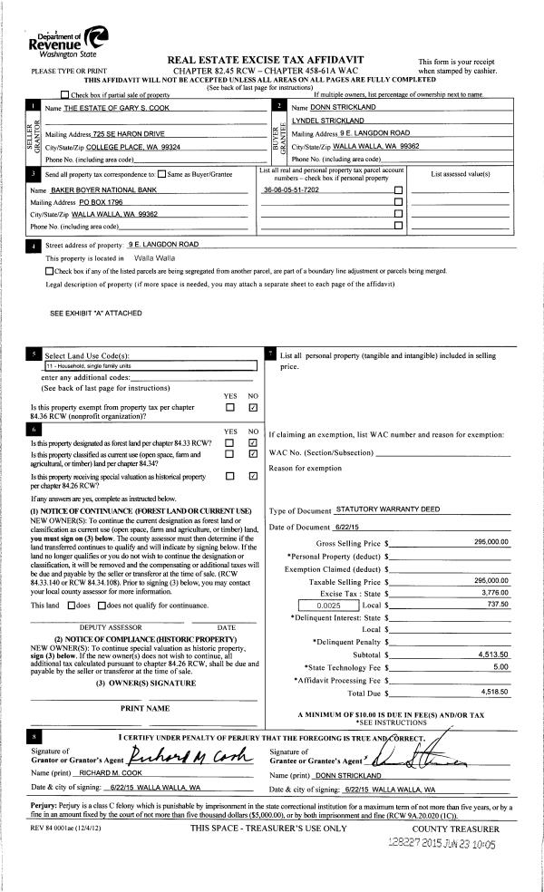 | 1 | 06/23/2015 | SWD | STATUTORY WARRANTY DEED | COOK GARY S ESTATE OF | STRICKLAND DONN & LYNDEL | | | $295,000.00 | 128227 | 2015-05249 |