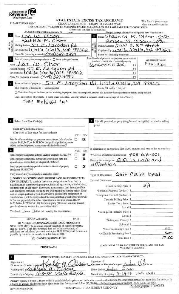 | Mailing Address: | 57 E LANGDON RD WALLA WALLA, WA 99362 | % Ownership: | 100.0000000000% |