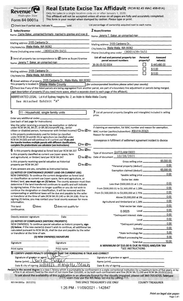 | 2 | 11/09/2021 | QCD | QUIT CLAIM DEED | BAKER JEREMY T & CARRIE | BAKER JEREMY T | | | $65,000.00 | 142847 | 2021-13429 |