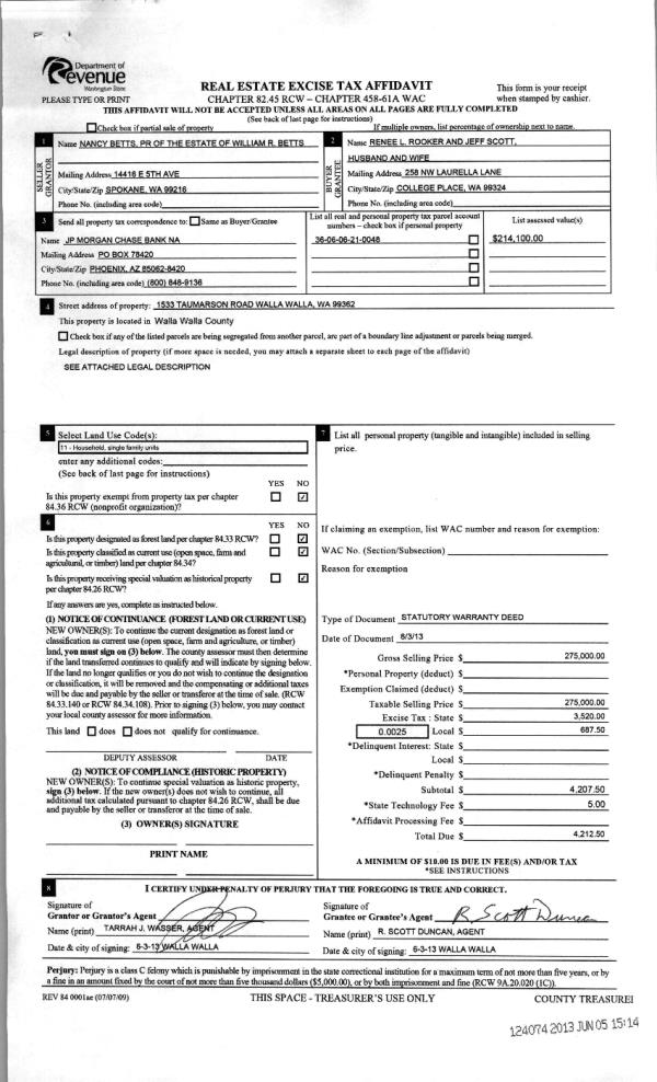 | 2 | 06/05/2013 | WARRANTY D | WARRANTY DEED | BETTS, NANCY B PER REP OF ESTA | SCOTT, JEFF | | | $275,000.00 | 124074 | 2013-05640 |