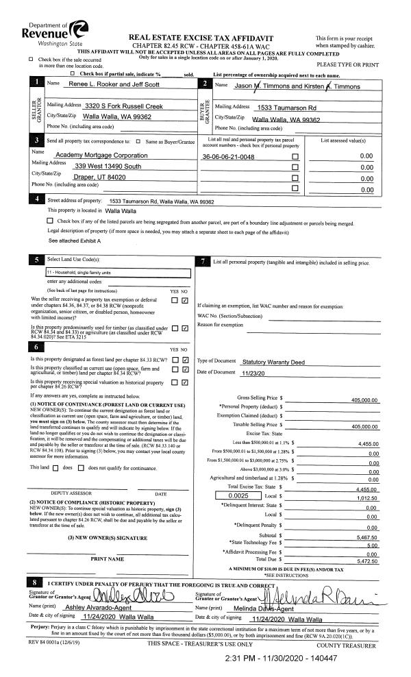 | 1 | 11/30/2020 | SWD | STATUTORY WARRANTY DEED | SCOTT JEFF | TIMMONS JASON & KIRSTEN | | | $405,000.00 | 140447 | 2020-12616 |