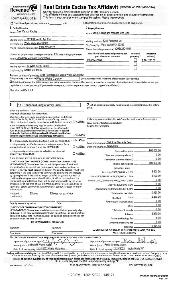 | 1 | 12/21/2022 | SWD | STATUTORY WARRANTY DEED | KEGLEY DALE VERNON | BLAIR JOHN A & MEAGAN DEE | | | $900,000.00 | 145171 | 2022-09837 |