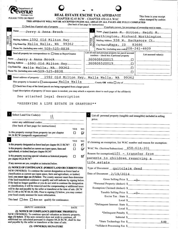 | 2 | 02/20/2014 | QCD | QUIT CLAIM DEED | BROCK ANNA R & JERRY 0 | BROCK JERRY 0 & ANNA R LIFE ESTATE | 2-PARCELS | | | 125453 | 2014-01252 |