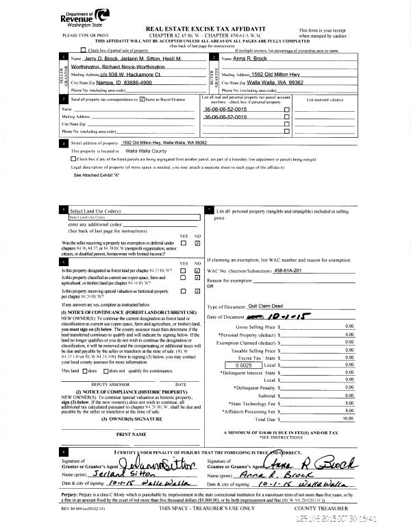 | 1 | 10/01/2015 | QCD | QUIT CLAIM DEED | BROCK JERRY 0 & ANNA R LIFE ESTATE | BROCK ANNA R | 2 PARCELS | | | 129108 | 2015-09523 |