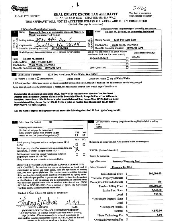 | 2 | 02/19/2014 | SWD | STATUTORY WARRANTY DEED | BRUCK DAYMON R | BRELAND WILLIAM M | | | $300,000.00 | 125452 | 2014-01241 |