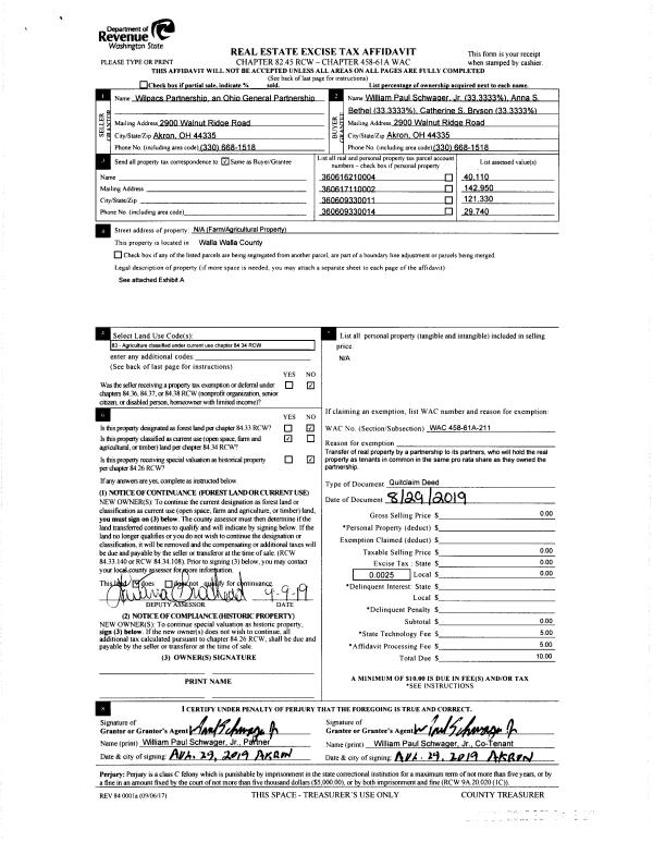 | 6 | 08/29/2019 | QCD | QUIT CLAIM DEED | WILPACS PARTNERSHIP | SCHWAGER WILLIAM PAUL JR (ET AL) | | | $0.00 | 137639 | 2019-06997 |