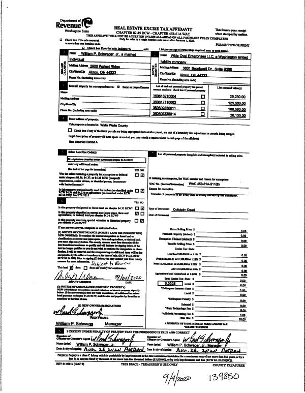 | 1 | 09/04/2020 | QCD | QUIT CLAIM DEED | SCHWAGER WILLIAM P JR | WIDE OVAL ENTERPRISES LLC | | | | 139850 | 2020-08985 |