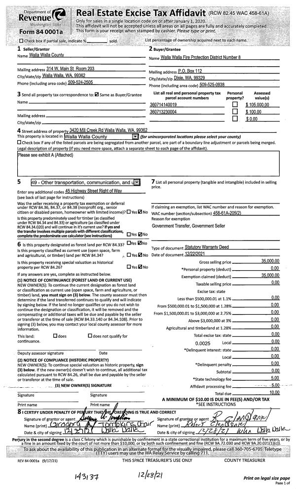| 2 | 12/22/2021 | SWD | STATUTORY WARRANTY DEED | WALLA WALLA COUNTY OF | FIRE PROTECTION DIST #8 | | 2-PARCELS | $0.00 | 143137 | 2021-15083 |