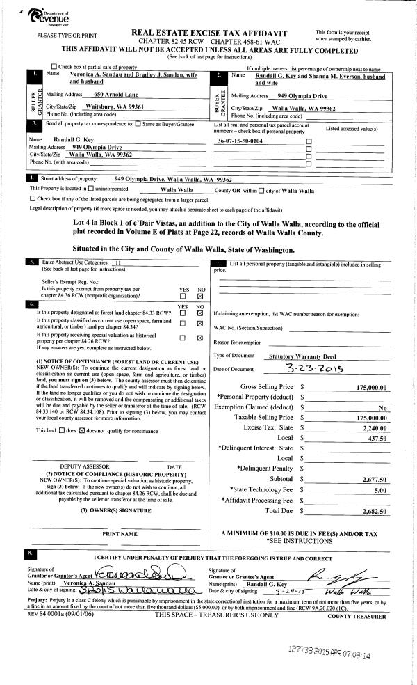 | 5 | 04/07/2015 | SWD | STATUTORY WARRANTY DEED | SANDAU BRADLEY J & VERONICA | KEY RANDALL G | | | $175,000.00 | 127738 | 2015-02817 |