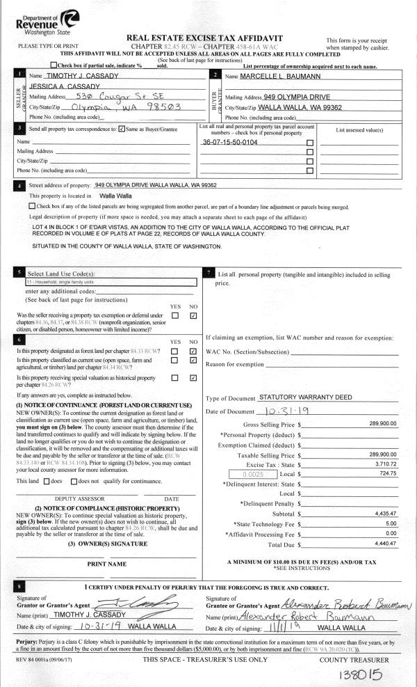 | 3 | 11/01/2019 | SWD | STATUTORY WARRANTY DEED | CASSADY TIMOTHY J & JESSICA A | BAUMANN MARCELLE | | | $289,900.00 | 138015 | 2019-08970 |
