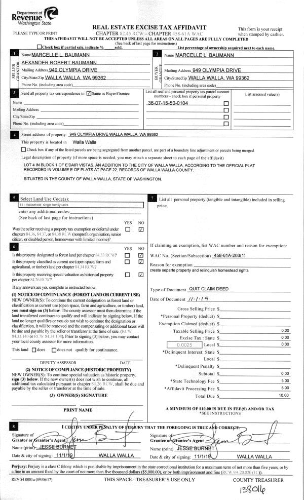 | 2 | 11/01/2019 | QCD | QUIT CLAIM DEED | BAUMANN ALEXANDER ROBERT | BAUMANN MARCELLE | | | | 138016 | 2019-08972 |