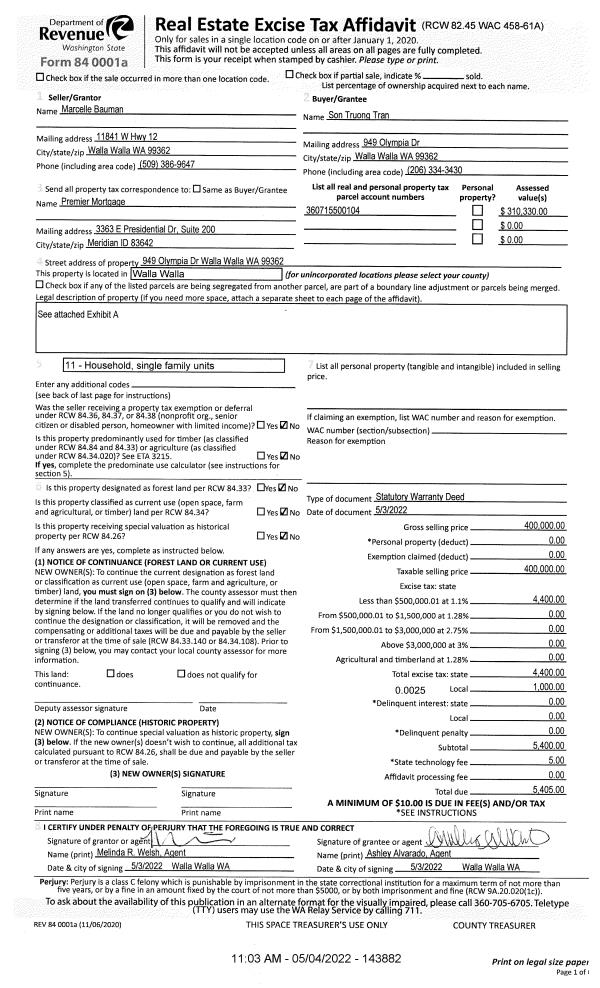 | 1 | 05/04/2022 | SWD | STATUTORY WARRANTY DEED | BAUMANN MARCELLE | TRAN SON TRUONG | | | $400,000.00 | 143882 | 2022-03802 |