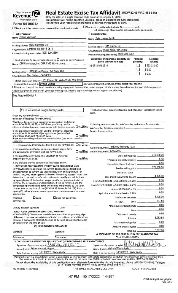 | 1 | 10/17/2022 | SWD | STATUTORY WARRANTY DEED | MOHRLAND COLTON | SMITH TYLER JAMES | | | $375,000.00 | 144871 | 2022-08493 |