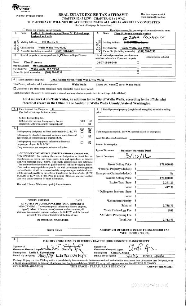 | 1 | 03/11/2016 | SWD | STATUTORY WARRANTY DEED | ECHTENKAMP LESLIE E & SUSAN M | ACUNA CLARA P | | | $179,000.00 | 129818 | 2016-01880 |