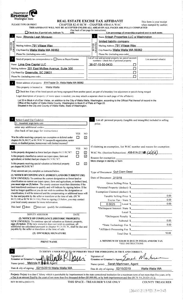 | 2 | 02/15/2019 | QCD | QUIT CLAIM DEED | MORAVEC RHONDA LEAH | ARLEAH PROPERTIES LLC | | | $0.00 | 136400 | 2019-01020 |