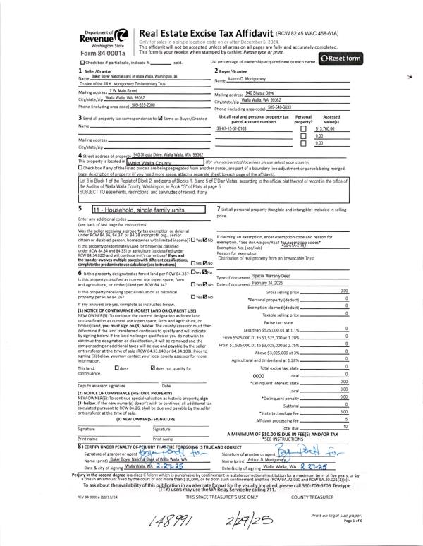 | 1 | 02/27/2025 | WARRANTY D | WARRANTY DEED | MONTGOMERY JILL K TESTAMENTARY TRUST | MONTGOMERY ASHTON D | | | | 148991 | 2025-01010 |
