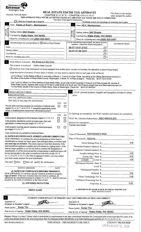 | 3 | 10/21/2015 | ADMD | ADMINISTRATOR'S DEED | MONTGOMERY SCOTT L | MONTGOMERY JILL K | 2 PARCELS | | | 129056 | 2015-09233 |