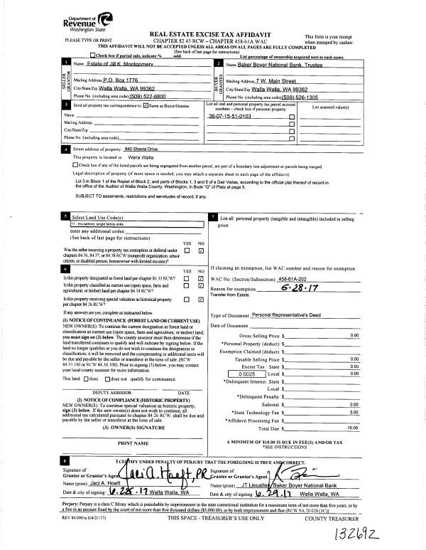 | 2 | 06/28/2017 | SWD | STATUTORY WARRANTY DEED | MONTGOMERY JILL K ESTATE | MONTGOMERY JILL K TESTAMENTARY TRUST | | | $0.00 | 132692 | 2017-05001 |