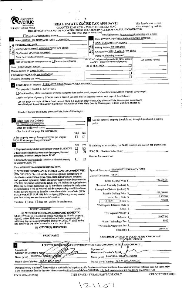 | 2 | 12/09/2011 | WARRANTY D | WARRANTY DEED | JOHNSON, JAMES L & TERRI L | NEEDHAM, DAVID R | | | $190,000.00 | 121107 | 2011-09727 |