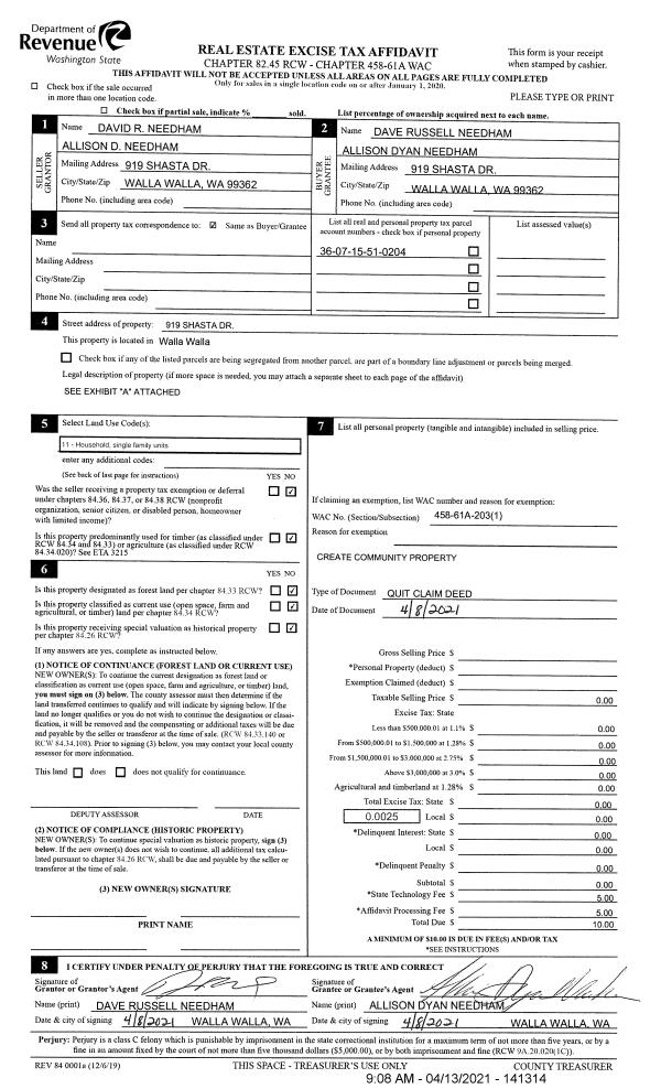 | 1 | 04/08/2021 | QCD | QUIT CLAIM DEED | NEEDHAM DAVID R | NEEDHAM DAVE RUSSELL & ALLISON DYAN | | | $0.00 | 141314 | 2021-04286 |