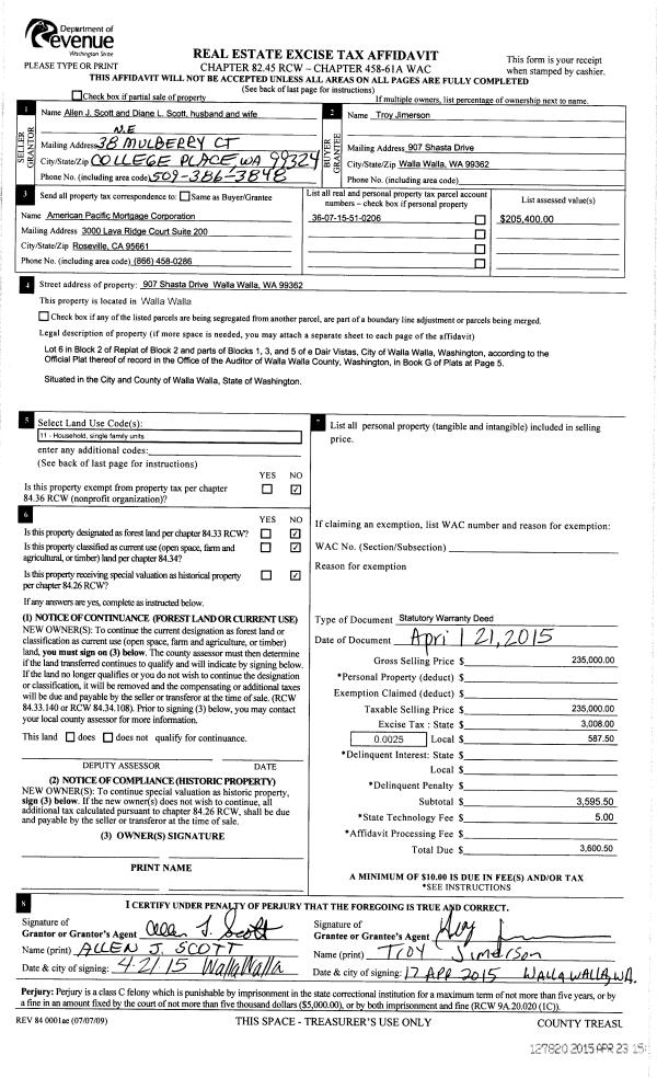 | 2 | 04/23/2015 | SWD | STATUTORY WARRANTY DEED | SCOTT ALLEN J & DIANE L | JIMERSON TROY | | | $235,000.00 | 127820 | 2015-03284 |