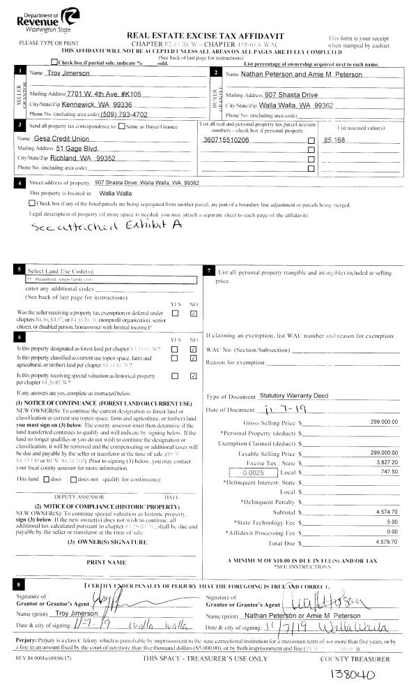 | 1 | 11/07/2019 | SWD | STATUTORY WARRANTY DEED | JIMERSON TROY | PETERSON AMIE M & NATHAN D | | | $299,000.00 | 138040 | 2019-09142 |
