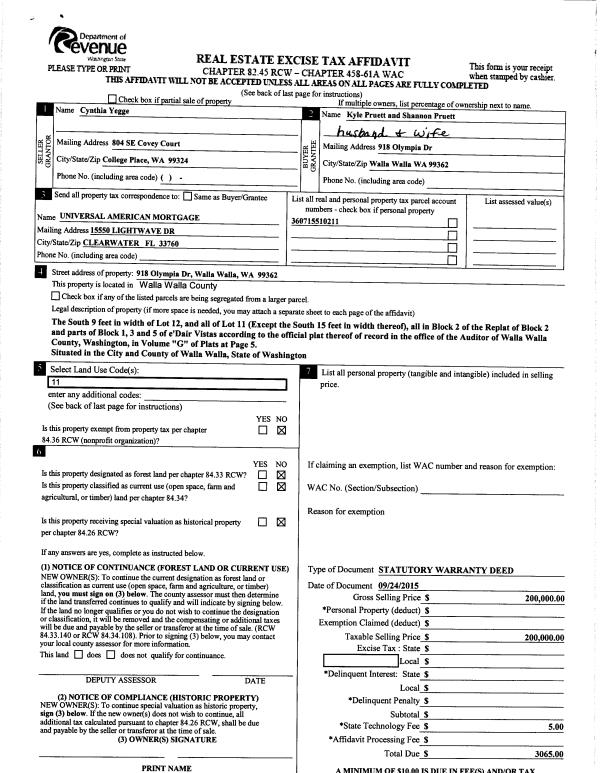 | 2 | 09/25/2015 | SWD | STATUTORY WARRANTY DEED | YEGGE CYNTHIA L | PRUETT KYLE & SHANNON | | | $200,000.00 | 128885 | 2015-08431 |