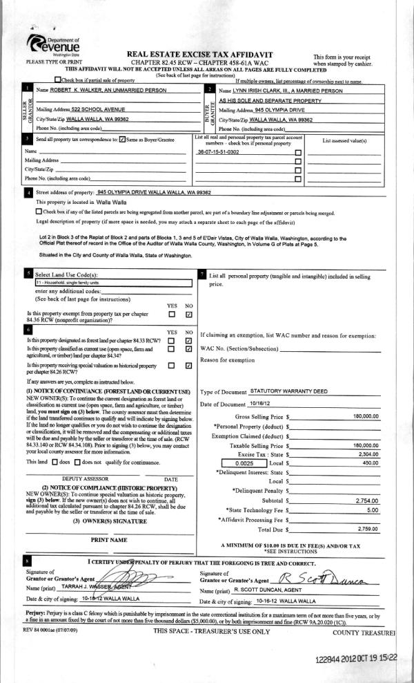 | 2 | 10/19/2012 | WARRANTY D | WARRANTY DEED | WALKER, ROBERT K | CLARK, LYNN IRISH III | | | $180,000.00 | 122844 | 2012-09238 |