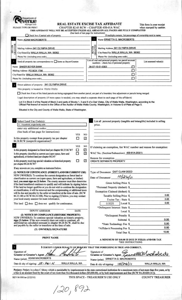 | 2 | 10/31/2011 | QCD | QUIT CLAIM DEED | MACROBERTS, ADAM | MACROBERTS, ERNETTA G | | | | 120892 | 2011-08469 |