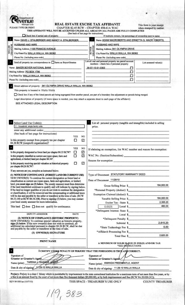 | 3 | 11/29/2010 | WARRANTY D | WARRANTY DEED | STALBERGER, DAVID J & NANCY A | MACROBERTS, ADAM & ERNETTA G | | | $184,000.00 | 119383 | 2010-09793 |