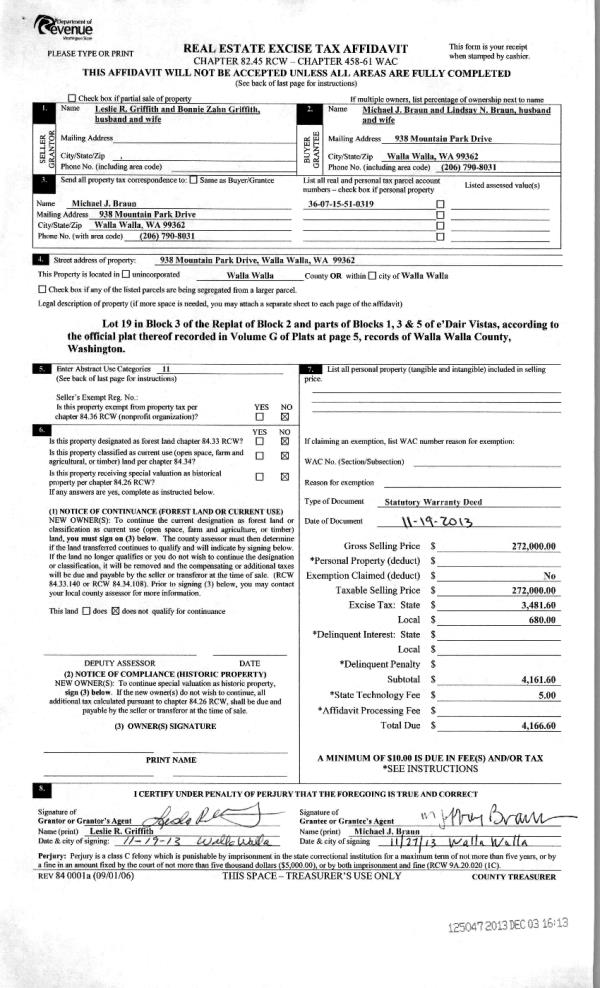 | 2 | 12/03/2013 | WARRANTY D | WARRANTY DEED | GRIFFITH LESLIE R & BONNIE | BRAUN MICHAEL J & LINDSAY N | | | $272,000.00 | 125047 | 2013-11678 |