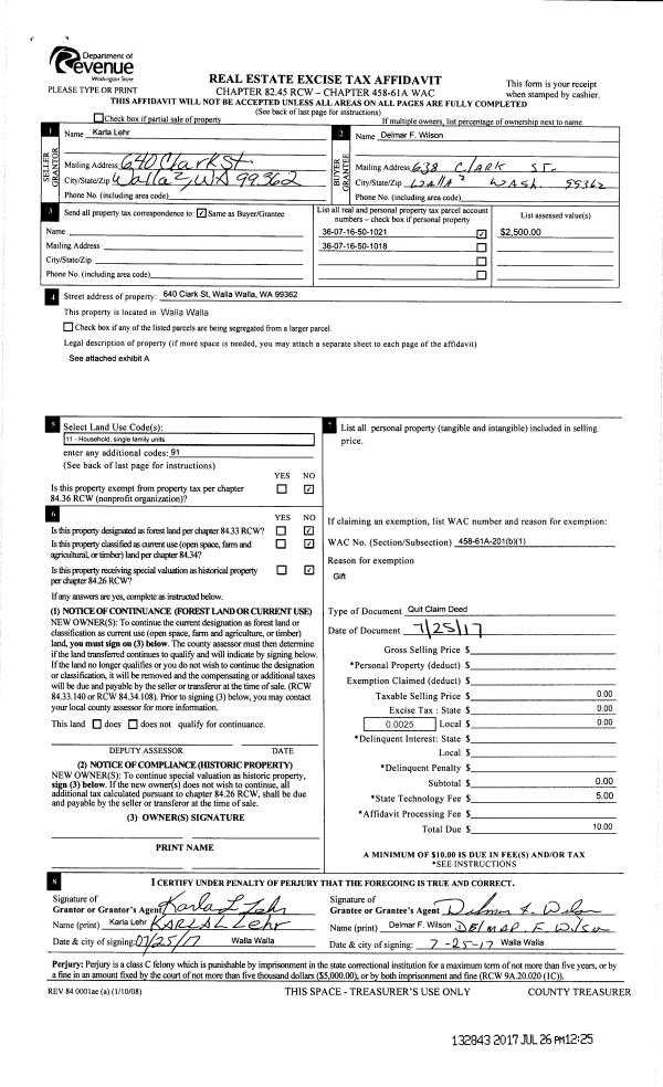 | 1 | 07/25/2017 | QCD | QUIT CLAIM DEED | LEHR KARLA | WILSON DELMAR F | | | $0.00 | 132843 | 2017-05682 |