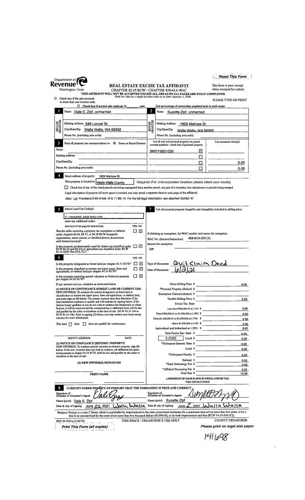 | 3 | 06/02/2021 | QCD | QUIT CLAIM DEED | ZIPF DALE E 50% | ZIPF SUZETTE | | | $0.00 | 141698 | 2021-06699 |