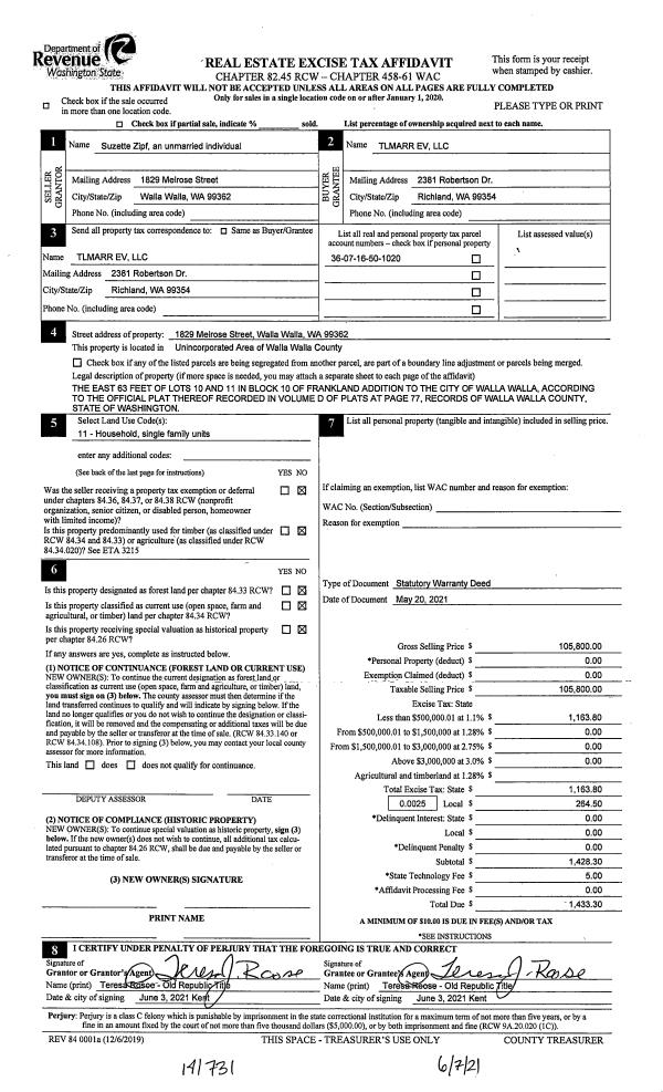 | 2 | 06/07/2021 | SWD | STATUTORY WARRANTY DEED | ZIPF SUZETTE | TLMARR EV LLC | | | $105,800.00 | 141731 | 2021-06845 |
