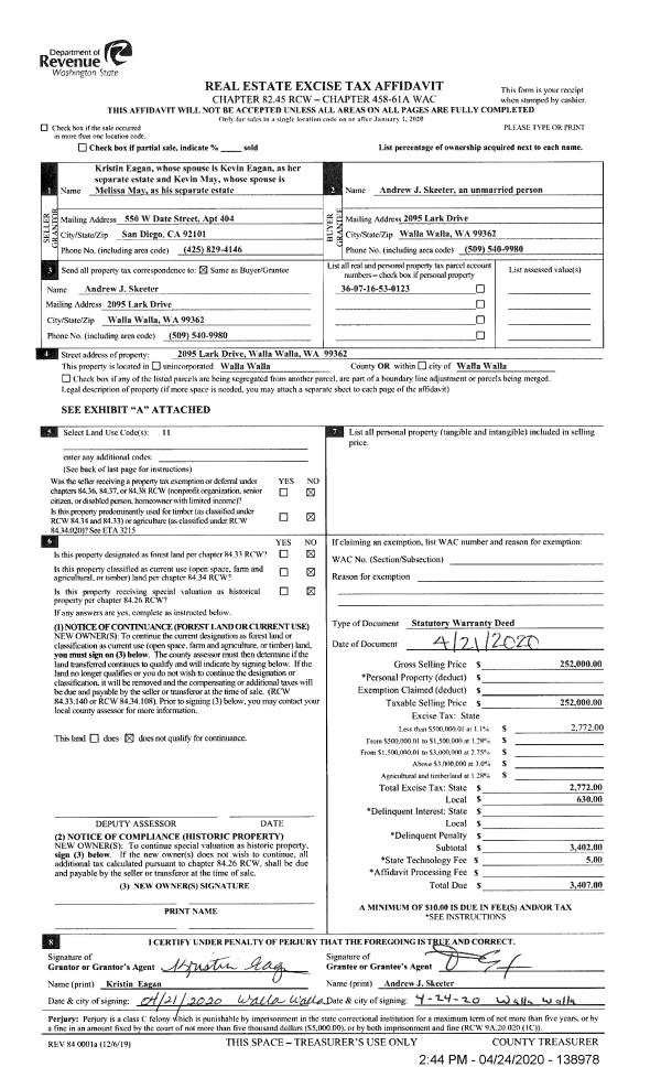 | 1 | 04/24/2020 | SWD | STATUTORY WARRANTY DEED | EAGAN KRISTIN M MAY (JTWRS) | SKEETER ANDREW J | | | $252,000.00 | 138978 | 2020-03536 |