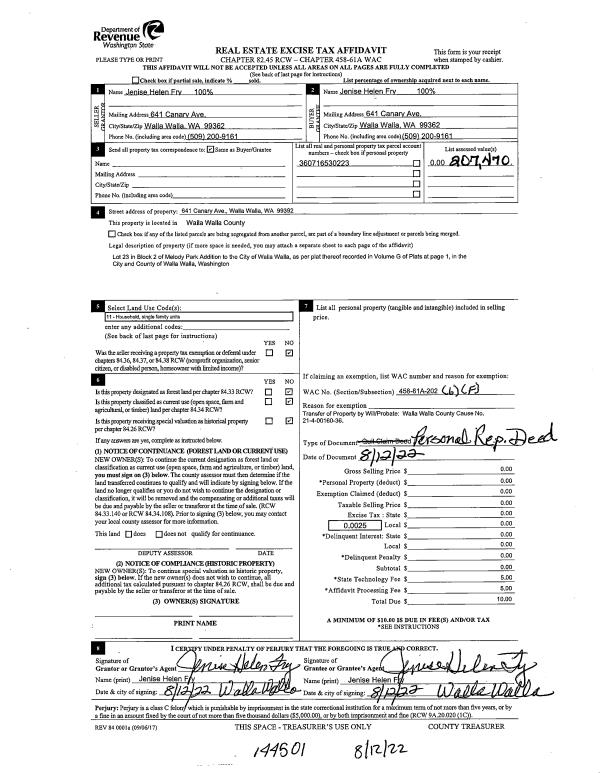 | 1 | 08/12/2022 | DPR | DEED OF PERSONAL REPRESENTATIVE | FRY GEORGE F | FRY JENISE HELEN | | | $0.00 | 144501 | 2022-06793 |