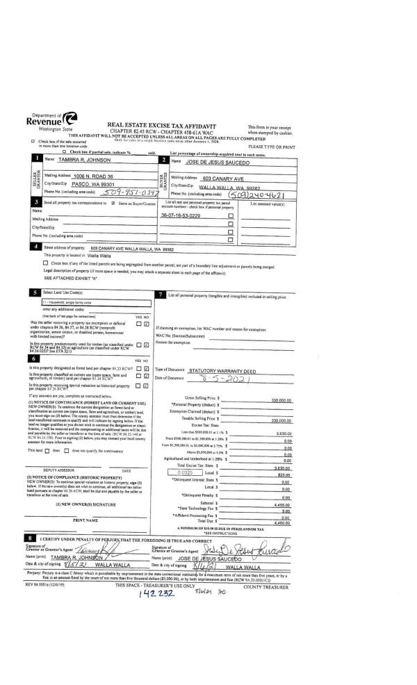 | 1 | 08/06/2021 | SWD | STATUTORY WARRANTY DEED | JOHNSON TAMBRA R | SAUCEDO JOSE DE JESUS | | | $330,000.00 | 142232 | 2021-09617 |