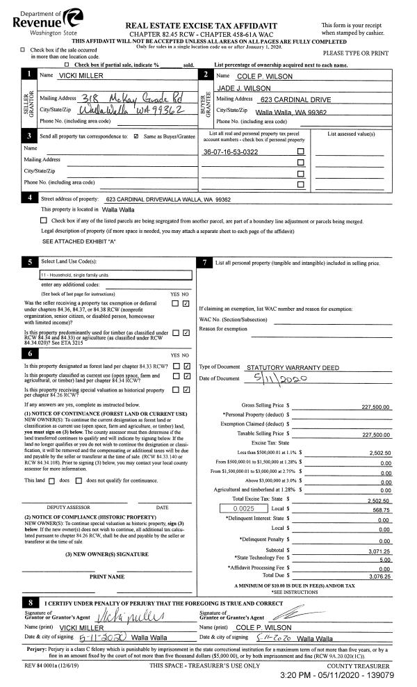 | 1 | 05/11/2020 | SWD | STATUTORY WARRANTY DEED | MILLER VICKI | WILSON COLE P & JADE J | | | $227,500.00 | 139079 | 2020-04050 |