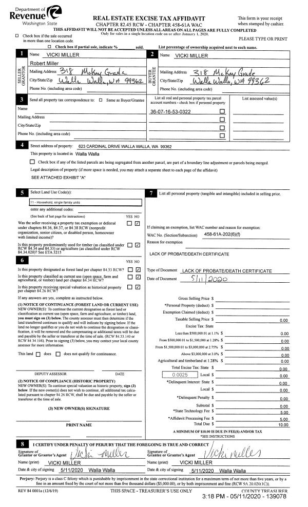 | 2 | 05/11/2020 | LOPA | LACK OF PROBATE AFFIDAVIT | MILLER ROBERT & VICKI | MILLER VICKI | | | $0.00 | 139078 | 2020-04049 |