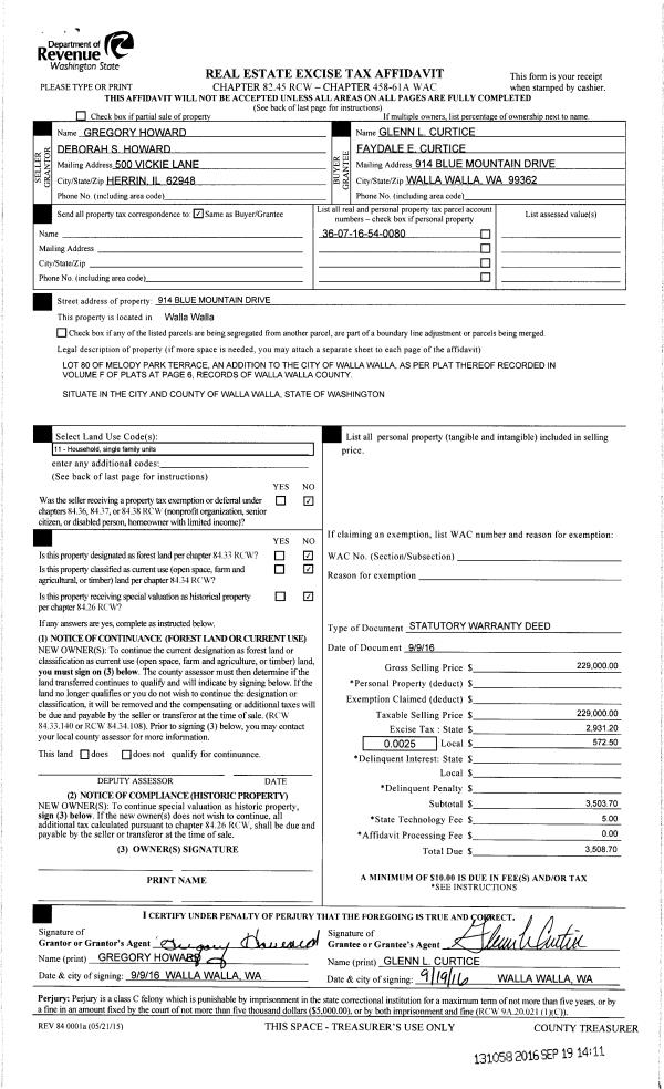 | 1 | 09/19/2016 | SWD | STATUTORY WARRANTY DEED | HOWARD GREGORY & DEBORAH S | CURTICE GLENN L & FAYDALE E | | | $229,000.00 | 131058 | 2016-07620 |
