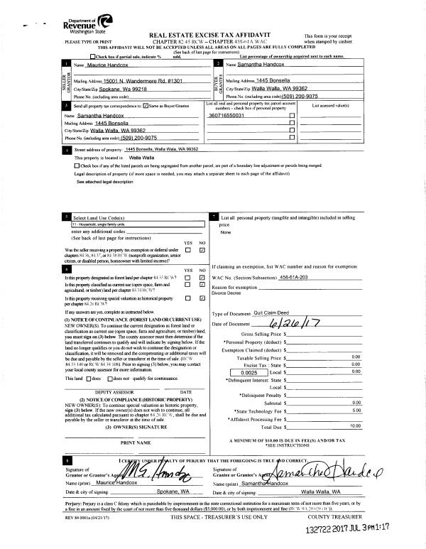 | 1 | 06/26/2017 | QCD | QUIT CLAIM DEED | HANDCOX MAURICE E & SAMANTHA | HANDCOX SAMANTHA | | | $0.00 | 132722 | 2017-05071 |