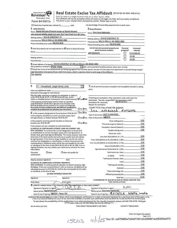 | Mailing Address: | RACHEL MORALES 1014 W CHESTNUT ST WALLA WALLA, WA 99362 | % Ownership: | 100.0000000000% |